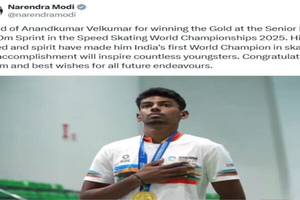 भारत के लिए गर्व का क्षण—आनंद कुमार वेलकुमार ने स्प्रिंट स्केटिंग विश्व चैम्पियनशिप कीसीनियर पुरुष 1000 मीटर स्प्रिंट स्पर्धा में स्वर्ण पदक जीतकरदेश का नाम विश्व पटल पर रोशन कर दिया। प्रधानमंत्री नरेंद्र मोदी ने इस ऐतिहासिक उपलब्धि पर सोशल मीडिया पोस्ट में कहा, “आनंद कुमार का धैर्य, गति और जज़्बा उन्हें स्केटिंग का पहला…