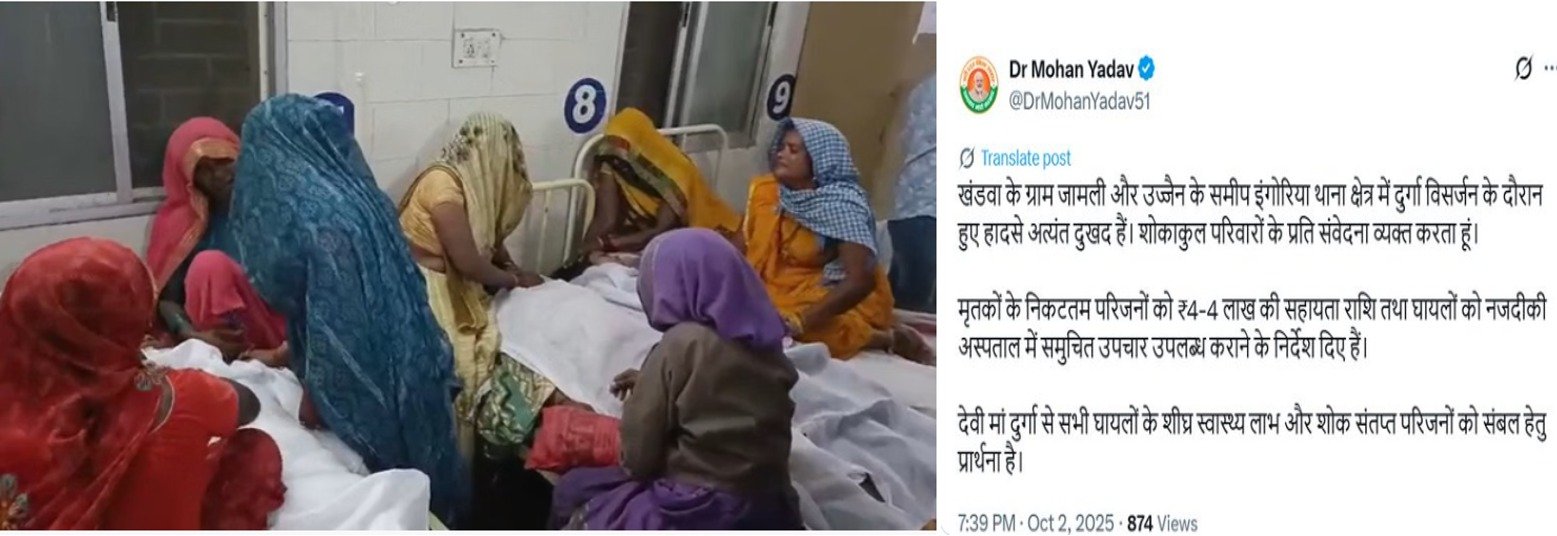 मध्य प्रदेश के मुख्यमंत्री डॉ. मोहन यादव ने खंडवा और उज्जैन के समीप इंगोरिया थाना क्षेत्र में दुर्गा विसर्जन के दौरान हुए हादसों पर गहरा शोक व्यक्त किया।