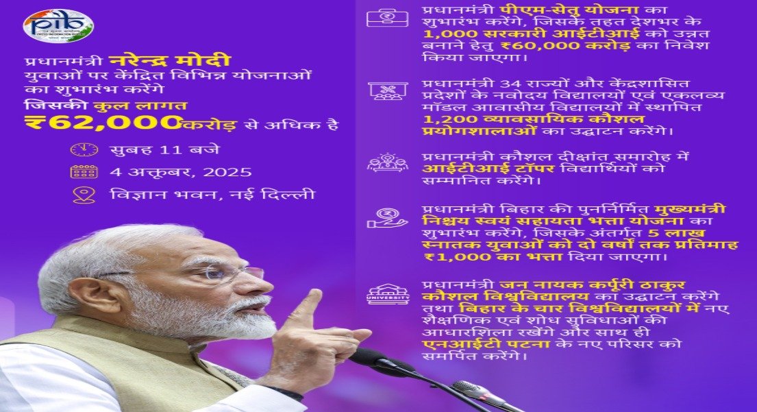नई दिल्ली, 4 अक्टूबर 2025 — प्रधानमंत्री नरेन्द्र मोदी आज नई दिल्ली के विज्ञान भवन से लगभग ₹62,000 करोड़ से अधिक की लागत वाली अनेक युवा-केंद्रित पहलों का शुभारंभ करेंगे।